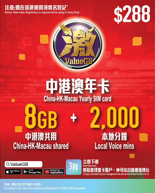 *成功啟用後即享16GB數據:成功啟用之儲值卡用戶送「8GB中港澳數據」,有效期由啟用當天起計1年(推廣期:2025年6月12日至2025年12月31日)
